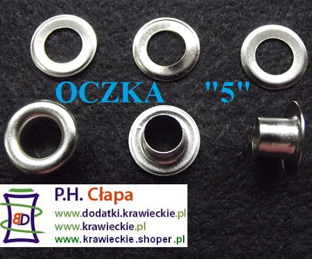 W sprzedaży posiadamy również metalowe oczka krawieckie i kaletnicze , które wykonane są z bardzo dorej jakości stali co zapewnia wysoki komfort pracy. Oczka kaletnicze "5" w naszej hurtowni występują w dwóch kolorach. Kolor nikiel oraz kolor oxyda. Wszystkie oczka w danym rozmiarze sprzedawane są w opakowaniach po 1000 szt. Do oczek w oddzielnej woreczku foliowym spakowane są podkładki.